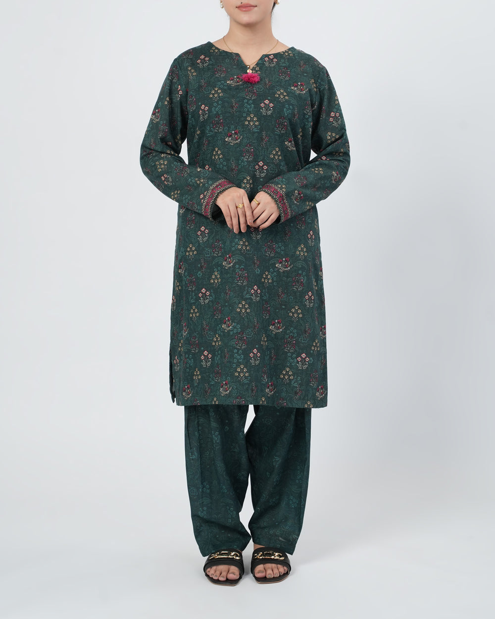 This Eminent women’s printed khaddar 2-piece suit offers warm, comfortable wear for the winter season. The soft khaddar fabric feels breathable while providing gentle warmth. The printed shirt paired with a matching trouser creates a neat, coordinated look. Ideal for daily wear, office routines, or casual gatherings. A simple and elegant outfit designed for everyday comfort.