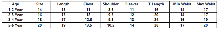 | Age | Size | Length | Chest | Shoulder | Sleeves | T.Length | Min Waist | Max Waist |