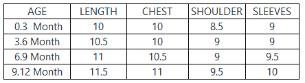 | AGE | LENGTH | CHEST | SHOULDER | SLEEVES |