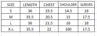 | SIZE | LENGTH | CHEST | SHOULDER | SLEEVES |